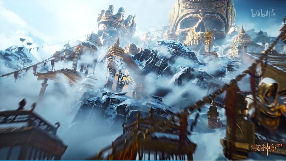 当牧儿一行人正式来到黄金宫前,玄机通过一段从山脚到山顶的长镜头全面展现了黄金宫整体的建筑风格与人物造型(天知道这一段我来回看了几遍,这个运镜调用真的很绝!)建筑整体以金色为基调,运用大量绘纹与骷髅,铁铃,圆顶,尖塔等元素,尽显大宗大教的雍容庄严。